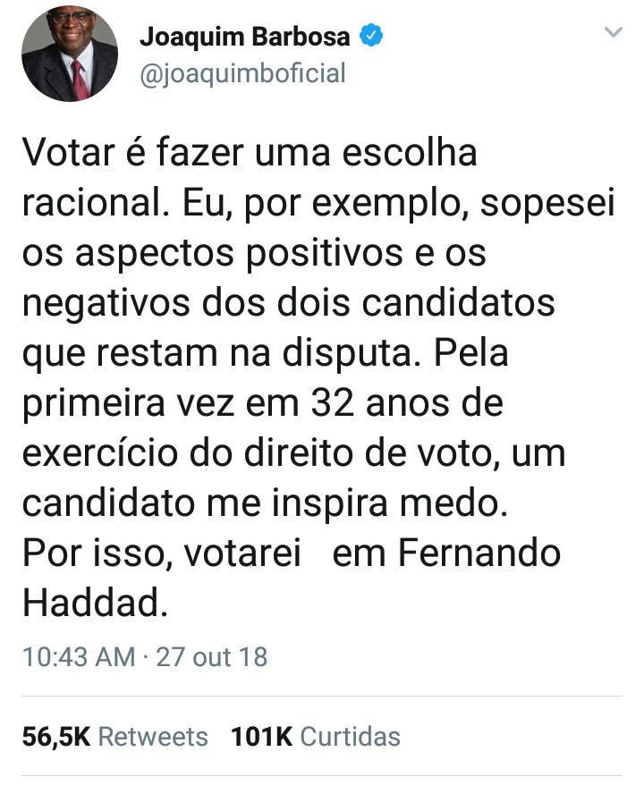 Joaquim Barbosa declara voto em Fernando Haddad