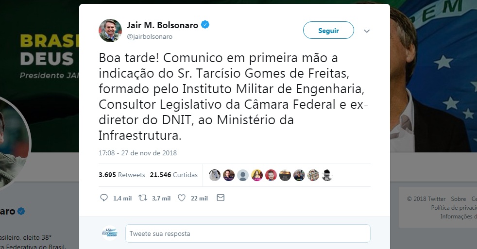 BRASÍLIA: Bolsonaro anuncia Ministro da Infraestrutura