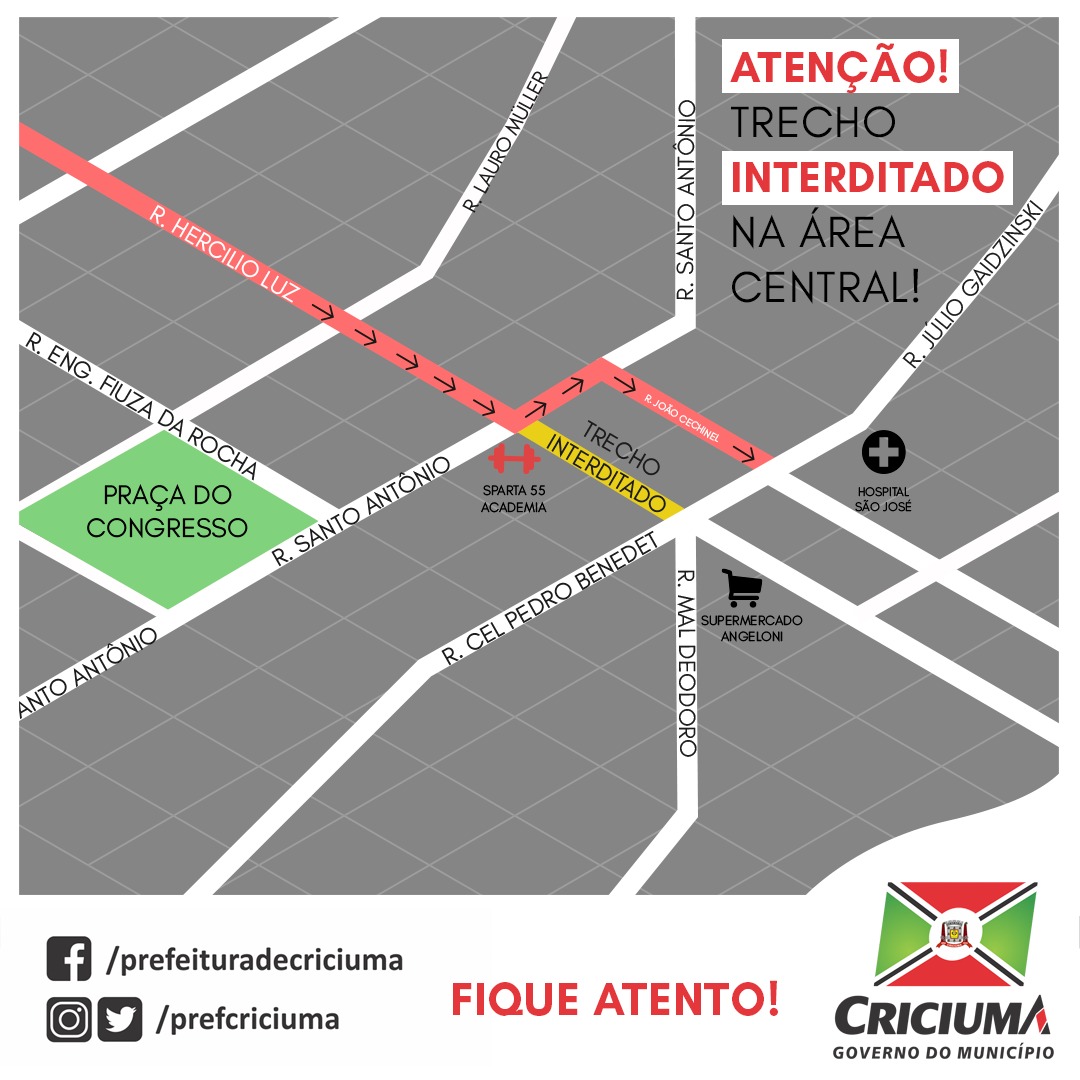 Rua Hercílio Luz, em Criciúma, bloqueada para obras neste sábado